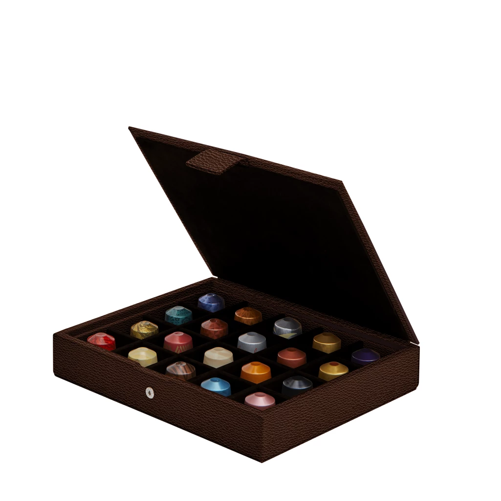 This sumptuous presentation box for Nespresso capsules is made in authentic leather. Welcome your guests by proposing them one of the 20 capsules on display in this beautiful coffee capsules box.