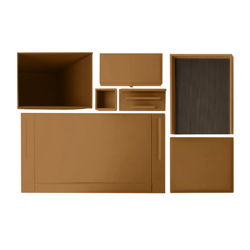Here is the sublime executive desk set made in smooth calf leather. We have put together several luxury office accessories to form this exquisite set that will melt in the refined décor of your work space. This elegant desk set in leather adds an exceptional touch to your interior decoration. <