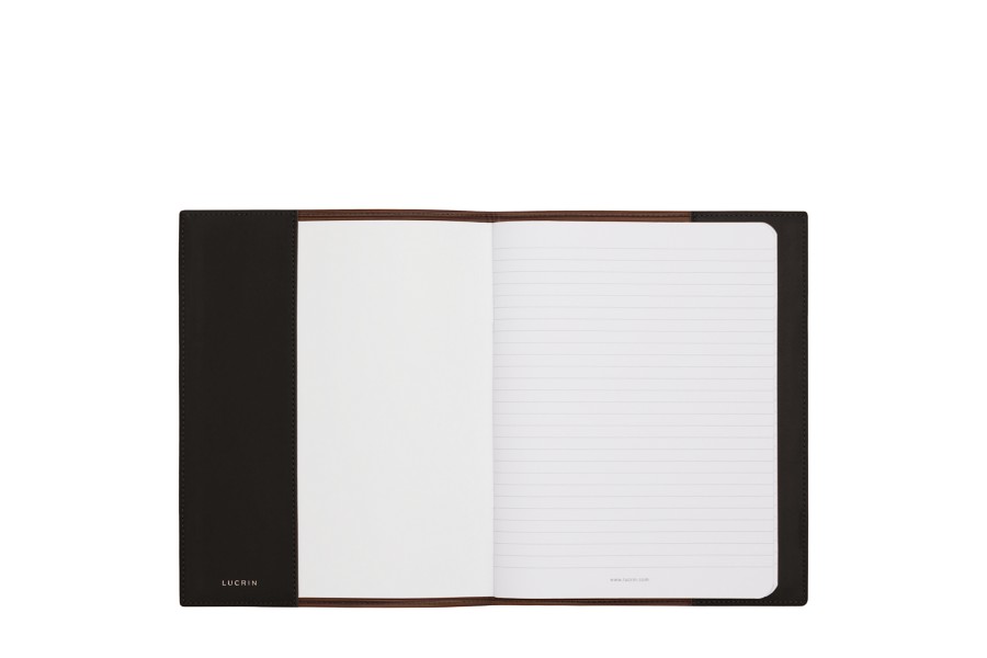 Made in authentic premium leather, this protective cover for A5-format notebook (of around 50 pages) is a beautifying and durable product. Beautifying, as it will turn your simple copybook into something much more classy. Durable, as it is conceived expertly by the finest leather craft artisans of Lucrin. The copybook is well held in place by two leather bands on each side in which you can slide in the hard cover of your notebook.