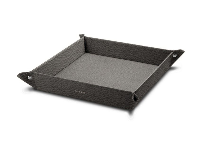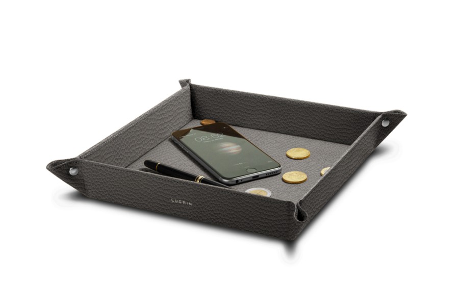 This is the XL-sized square solid catchall from Lucrin. Whether placed on a desk or on a console table in the entryway, this always useful accessory prevents you from having to search for your keys or phone. The four corners of the square leather catchall are held in place with nickel-plated rivets. This luxury decorative item is popular with designers and decorators alike due to its availability in an infinite number of shades and materials to match any decor (modern, retro, baroque, ...)