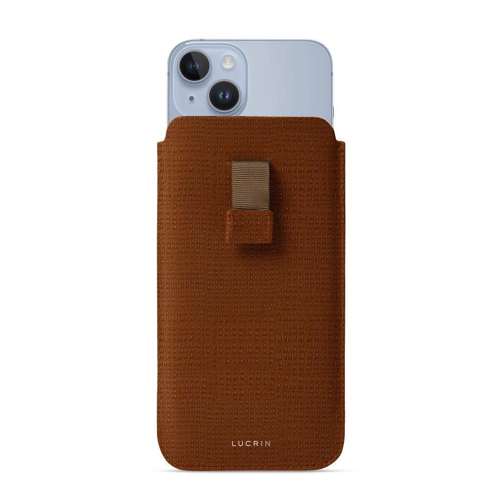 This leather sleeve with pull tab by LUCRIN Geneva is the ideal combination of a classic design with innovation just like your iPhone 14 Plus. A seamless construction with luxury leather and a protective premium microfibre lining, this sleeve pouch will house your device securely. The double layer of leather and microfibre also provides impact resistance and scratch protection to your iPhone. The case’s tight fit is intended to relax over time so as to perfectly take the form of your brand new and sleek device. Charge your phone without ever removing it from its sleeve pouch with this functional MagSafe compatible accessory. The pull-tab is made out of a strong nylon string and finished with a leather piece for more elegance. Personalise your case in the leather type and colour of your choice. You may even change the colour of your stitchings or engrave your name for more character!
