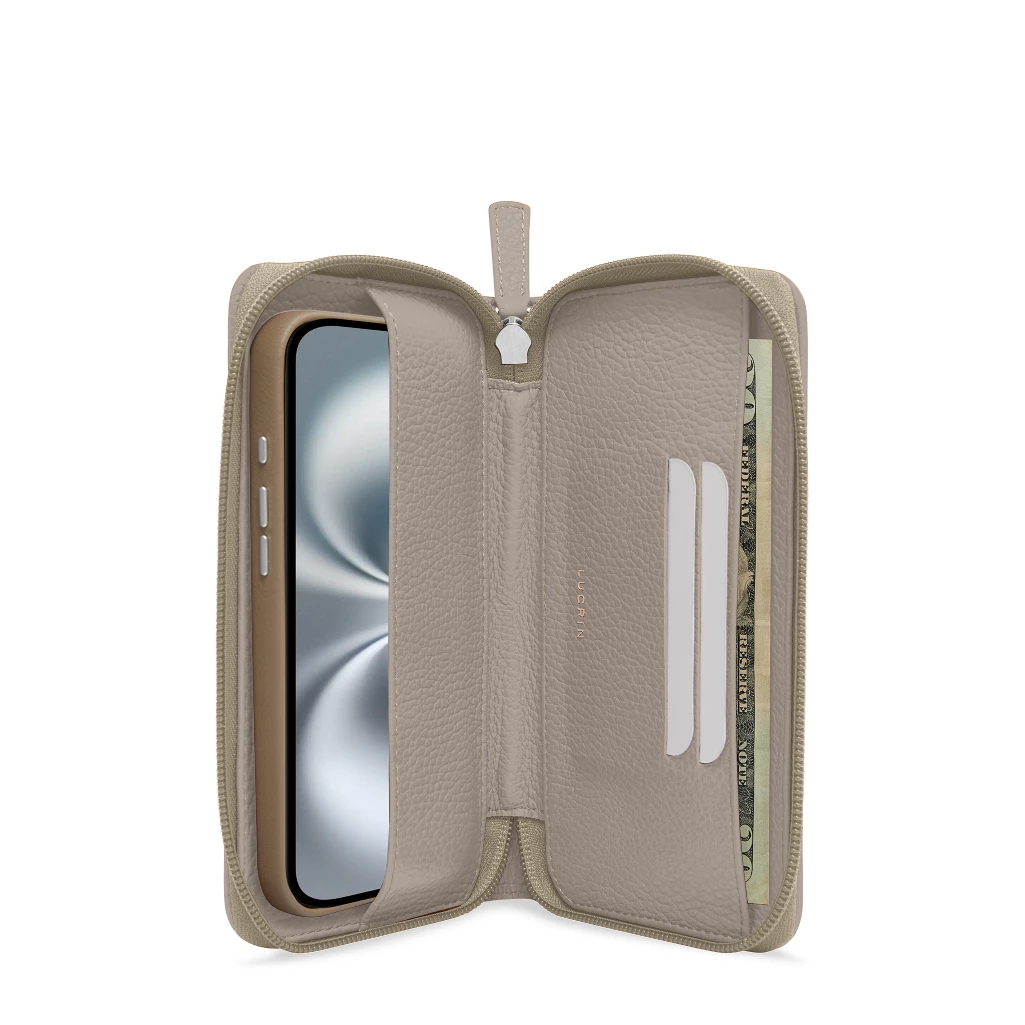 Elevate your style and safeguard your iPhone 16 Plus with this exclusive zip-around wallet from LUCRIN Geneva. Perfect for parties or running errands, this essential accessory combines elegance and functionality. It features 2 dedicated card slots and 2 additional compartments—one for your bills and notes, and another for your phone. The phone slot is lined with luxurious microfiber to prevent scuffs and scratches. A secure zip closure ensures that all your items stay safely tucked inside. Customise this zip-around wallet to suit your style by choosing your preferred leather colour and type. Add a unique touch with an engraving of your initials or name.